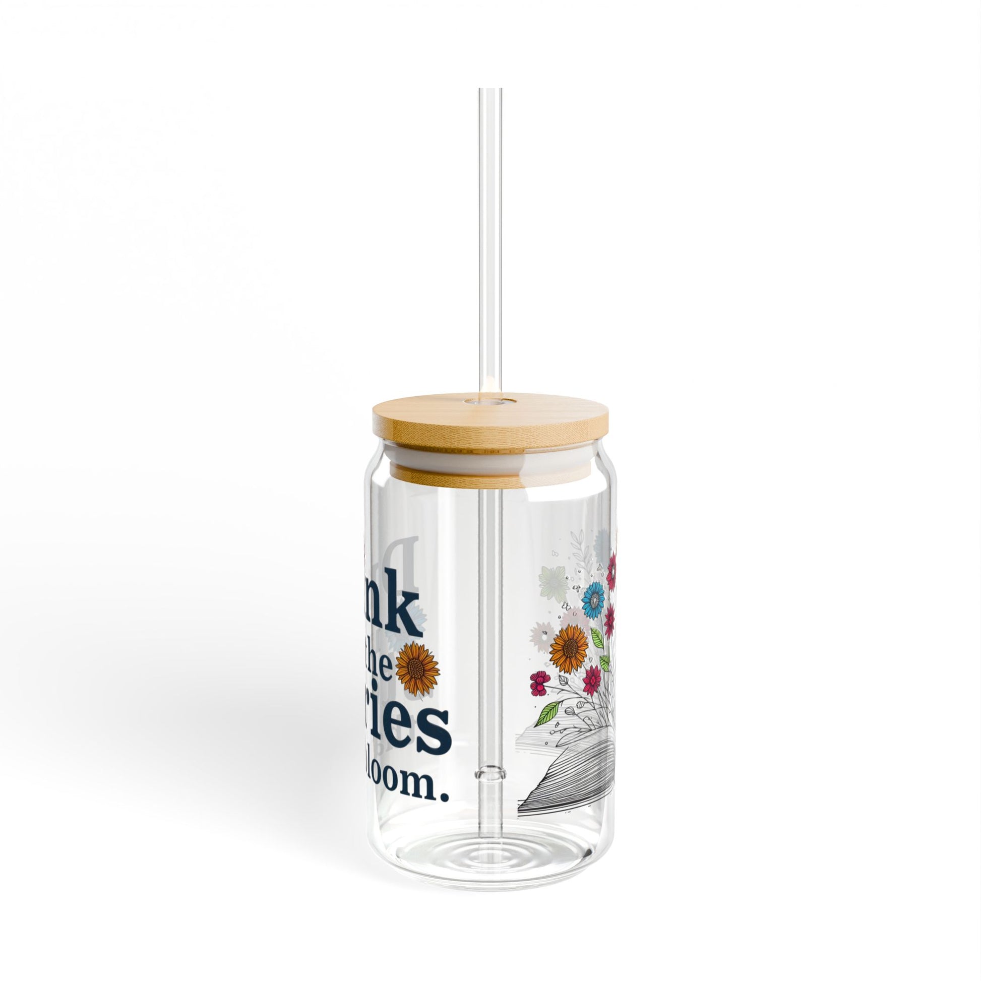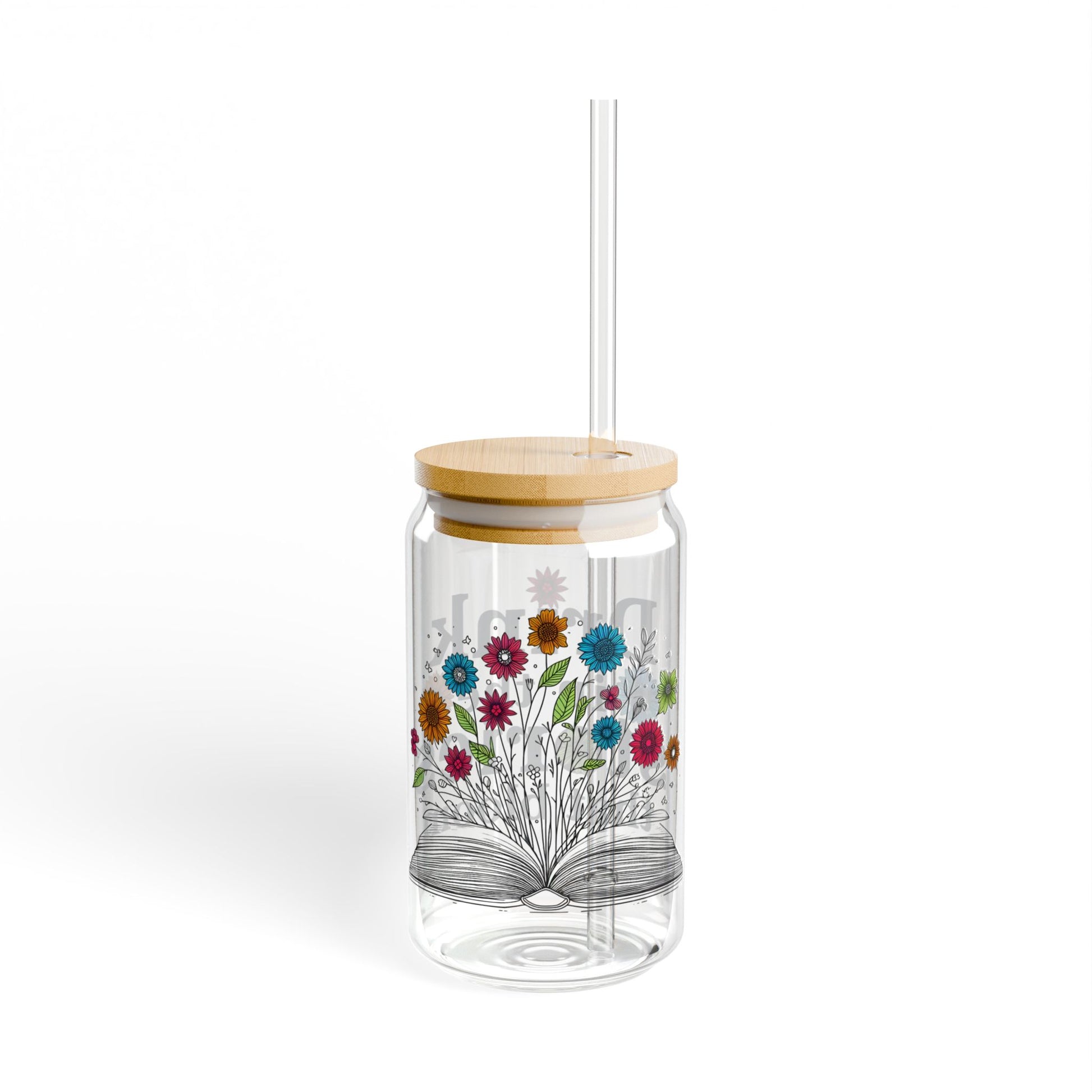 16oz Floral Book Sipper Glass – 'Drink in Stories' Reusable Mason Jar Tumbler