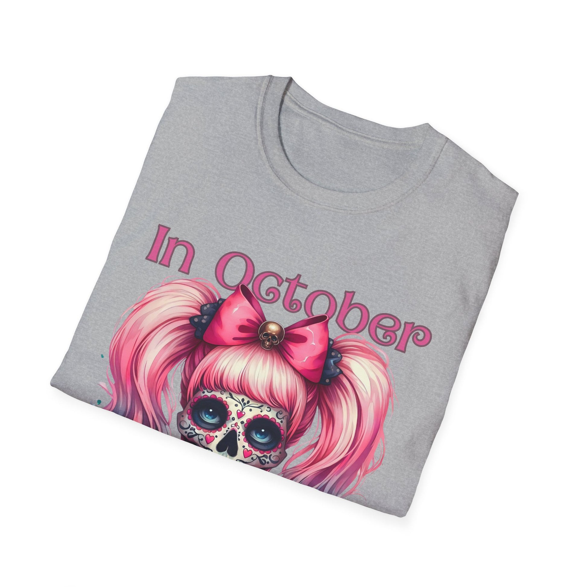 In October We Wear Pink T-Shirt | Unisex Breast Cancer Awareness Tee with Sugar Skull & Pink Ribbon Design